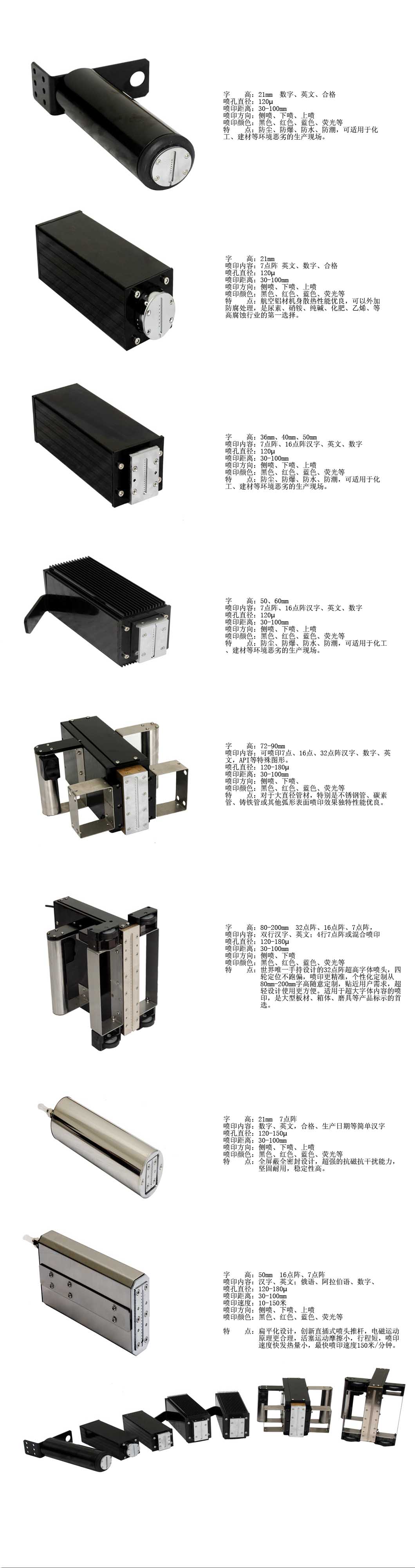 基本配置:5x5、7x5、16x16、32x32阵喷头或最多支持12个喷头组合体 ,字高可选10mm、14.4mm、21mm、25mm、27mm、30mm、36mm、40mm、50mm、60mm、72mm、90mm、100mm、160mm或组合喷印3000mm字型,可以喷单行汉字、数字、英文,双行数字、英文,整机模块化设计,无需外接气源。